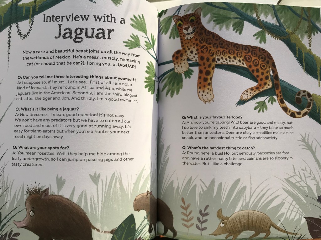 Interview with a Tiger is a terrific non-fiction book with a great format; fascinating animal facts are presented as answers to interview questions. A range of clawed beasts are interviewed including a jaguar, a polar bear, and a giant armadillo. In total, ten animals are featured. Each animal has its own distinctive personality and loads of attitude: the grumpy wolf, the jokey three-toed sloth, the laidback giant anteater…