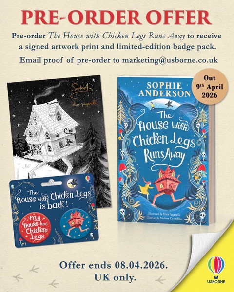 Usborne are running a UK-only pre-order campaign for The House with Chicken Legs Runs Away where you can get your hands on a limited-edition badge pack and stunning artwork print, with foiled signatures from Sophie Anderson and Elisa Paganelli. All you have to do is pre-order The House with Chicken Legs Runs Away before the 8th April and email proof to Usborne’s marketing department (marketing@usborne.co.uk).